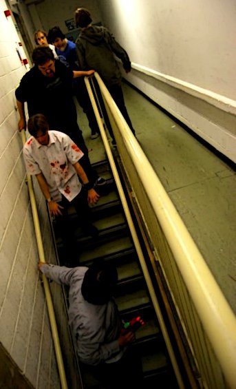 The run system scales down very small – our smallest game at Shunt involved three rooms, one staircase, twelve zombies, and teams of just three or four survivors – but our most successful games so far involve teams of six to eight people against about fifty zombies, in a university building.