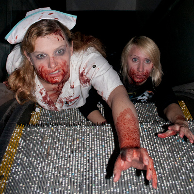 Our events usually take place in a big empty building. Each “run” of the day begins with most players alive, armed and desperate to escape. Zombies and other unpleasant creatures hunt the humans through darkened hallways, attacking and infecting the humans until they’ve all become undead or until the stragglers have made it to safety. When a round ends we swap the roles around a bit and start again, so that everyone gets to experience the terror from both sides.